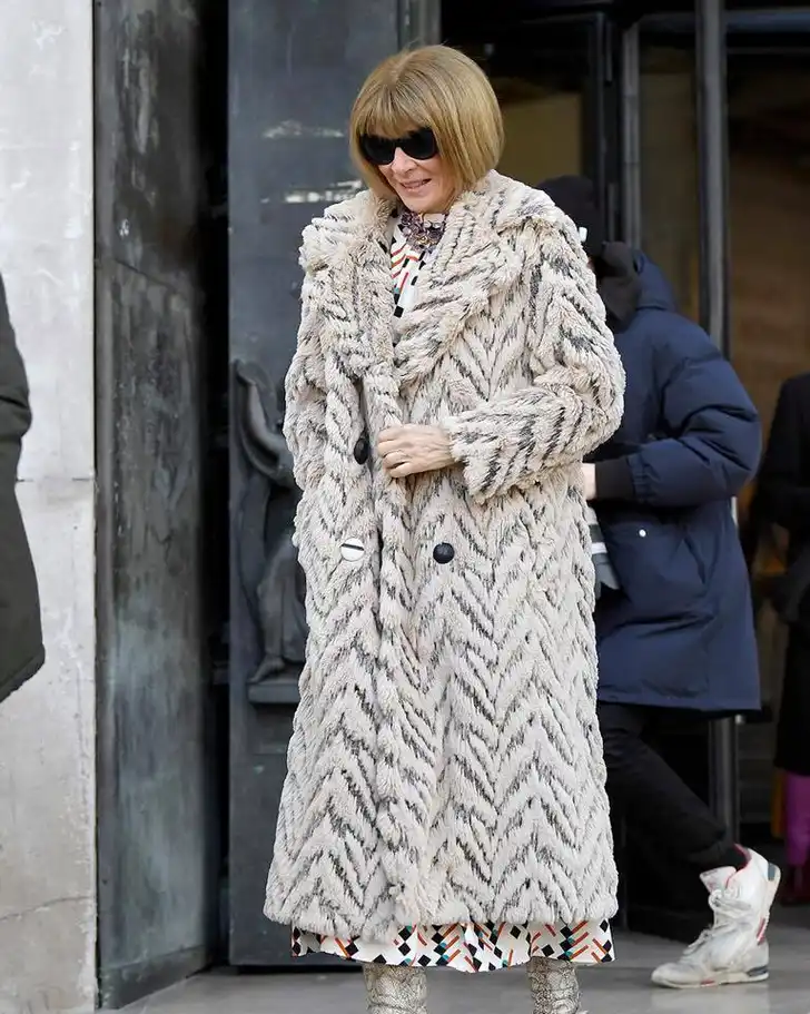 Anna Wintour in een grijze faux fur mantel van Stella McCartney.