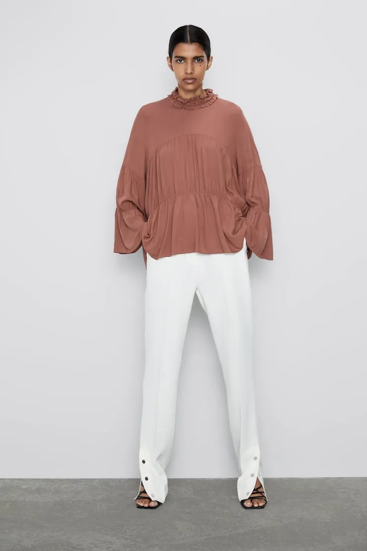 Soepelvallende blouse met geplooide opstaande kraag en lange wijde mouwen (Zara € 10)