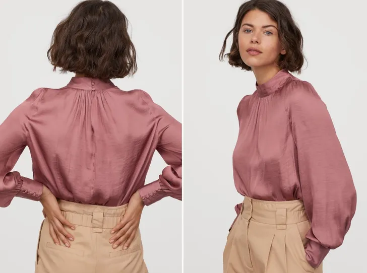 Blouse met opstaande kraag en knoopjes van achteren (H&M, verkrijgbaar in vier kleuren € 15)