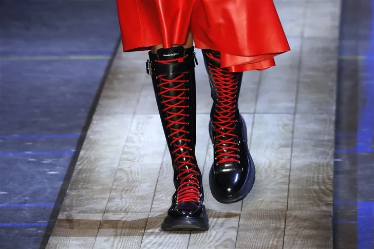 Alexander McQueen zette eveneens in op Victoraans, compleet met rijglaarzen...