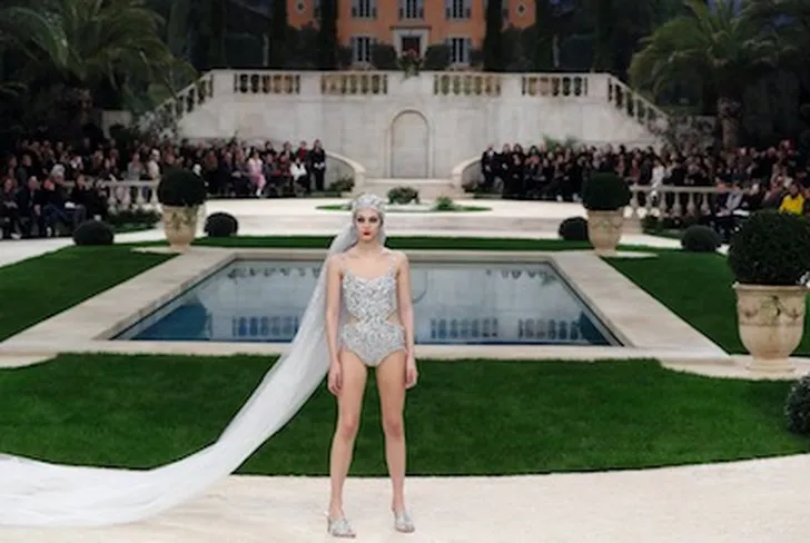 Karl Lagergeld heeft het Grand Palais voor de shows van Chanel al tot zo’n beetje alles laten verbouwen. Dus ook dit jaar konden we weer iets prachtigs verwachten. We waanden ons in een luxe villa aan de Franse Rivièra. Een mooie show met als hoogtepunt de bruidsbadpak van glitter.