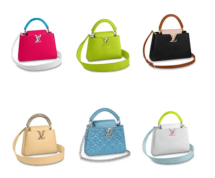 Voor S/S 2020 wordt de Capucines uitgebracht in klassiek zwart, snow en frisse voorjaarskleuren. De tas is verkrijgbaar in PM (small), BB en de nieuwe permanente Mini-maat.