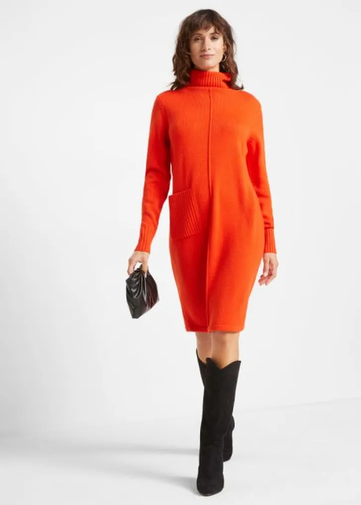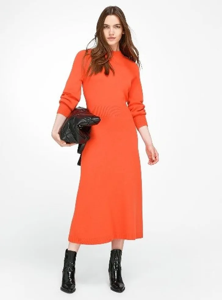 Zo'n gebreide jurk is een uitkomst op koude dagen: lekker warm, net even wat gekleder dan een trui en met een niet al te nauwsluitende rok ook nog een beetje zwier, al is deze wel aan de prijs. De top van deze combinatie kost € 414 en de rok van Hearst kost € 834