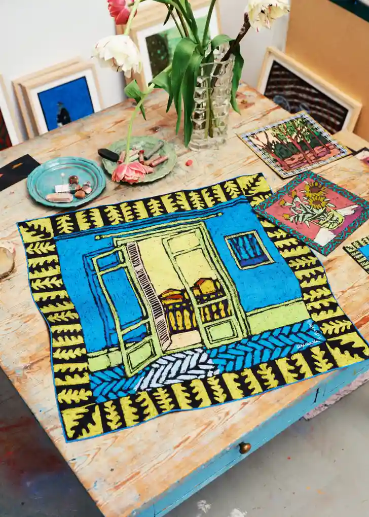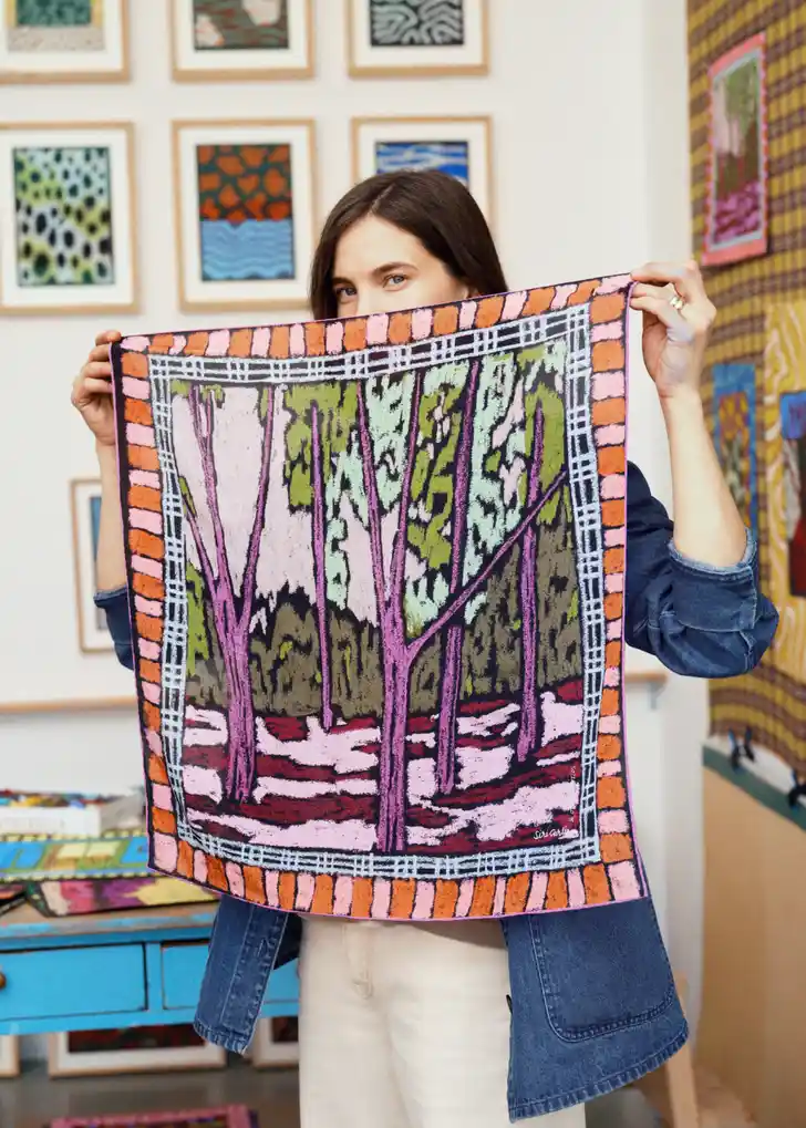 "Het is echt inspirerend om haar tekeningen en persoonlijke ervaringen op onze zijden sjaals te zien. Ze moedigen ons aan om in het moment te zijn en niet voorbij te gaan aan de kleine stijldetails die het kleden zo individueel maken."