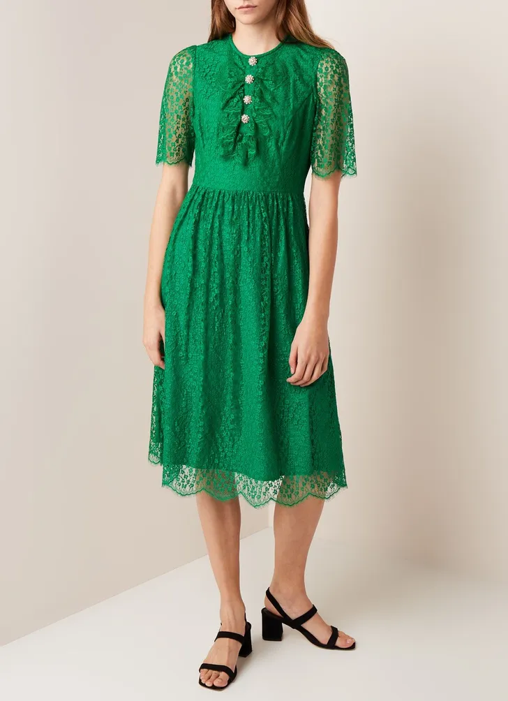 De Mallory midi-jurk van kant met strass van L.K. Bennett (Bijenkorf € 175)