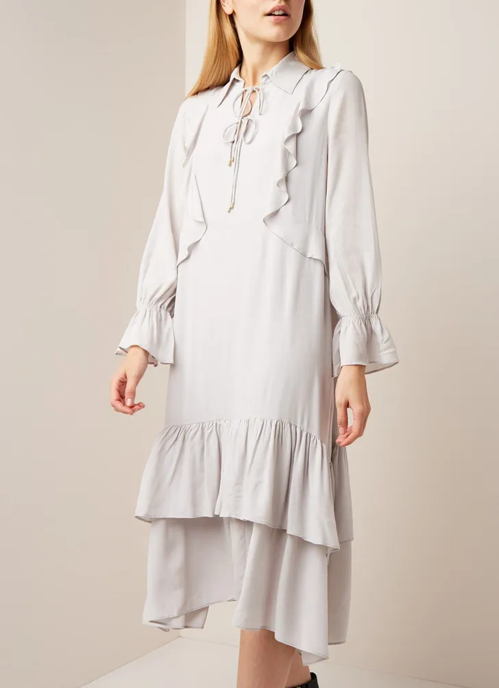 Mango Keira tuniekjurk van crêpe met volant (Bijenkorf € 40)