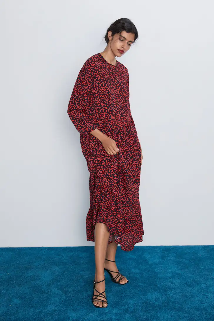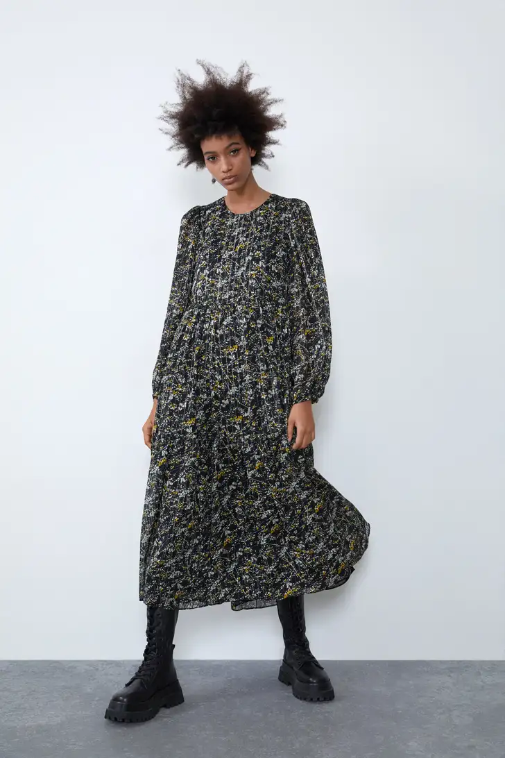 Wijde midi-jurk met ronde hals en lange ballonmouwen, doorstikt met metaalgaren (Zara € 20)