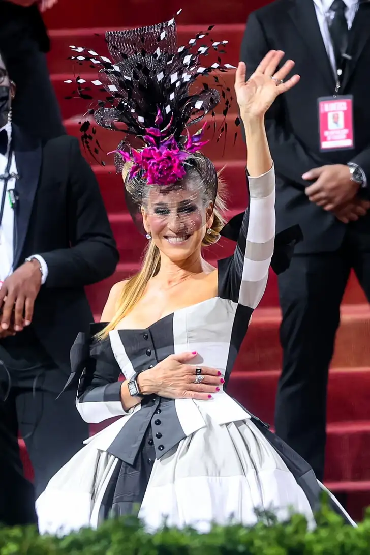 Sarah Jessica Parker pakte als gebruikelijk uit met spektakel op haar hoofd. Het geheel had wel iets Alice in Wonderland-achtigs.