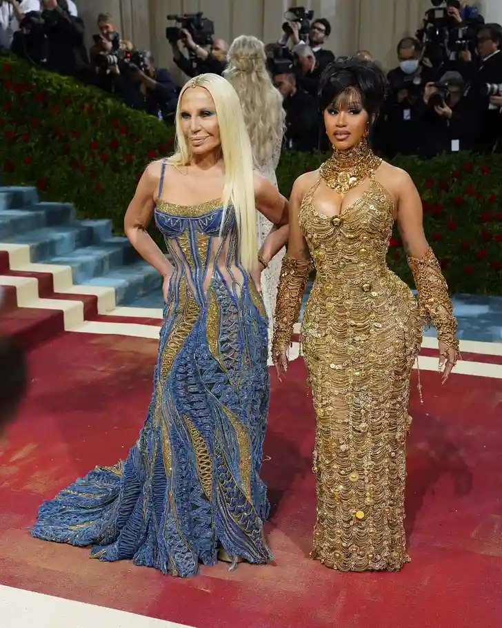 Donatella Versace en Cardi B in goud – check ook even de gouden versiering van Donatella's scheiding, leuk detail.
