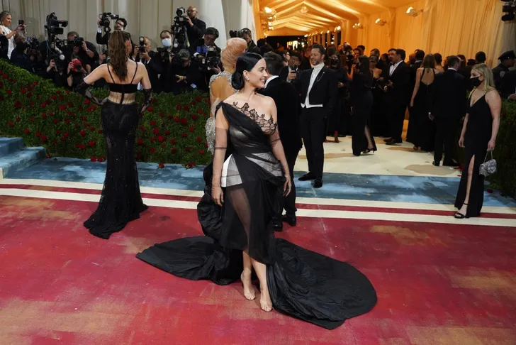 Katy Perry's jurk was een buitengewoon onsamenhangend geheel van kant, sleep, asymmetrie en wat op het eerste gezicht een grote witte onderbroek lijkt (het was een onderrokje).