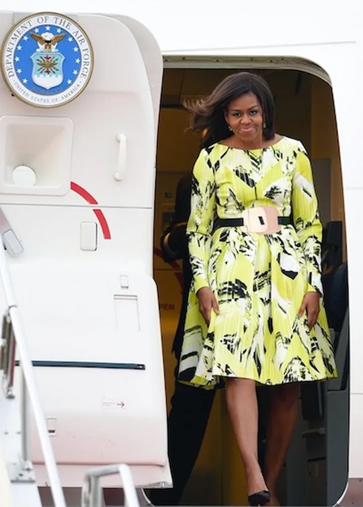 De voormalig first lady is ook dol op opvallende kleuren en prints. Zo droeg ze tijdens een bezoek aan Japan een lekkere knalkleur. Michelle koos voor een citroenkleurige japon van Kenzo met veel print.
