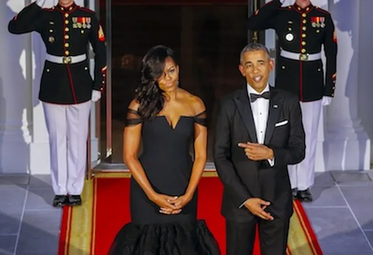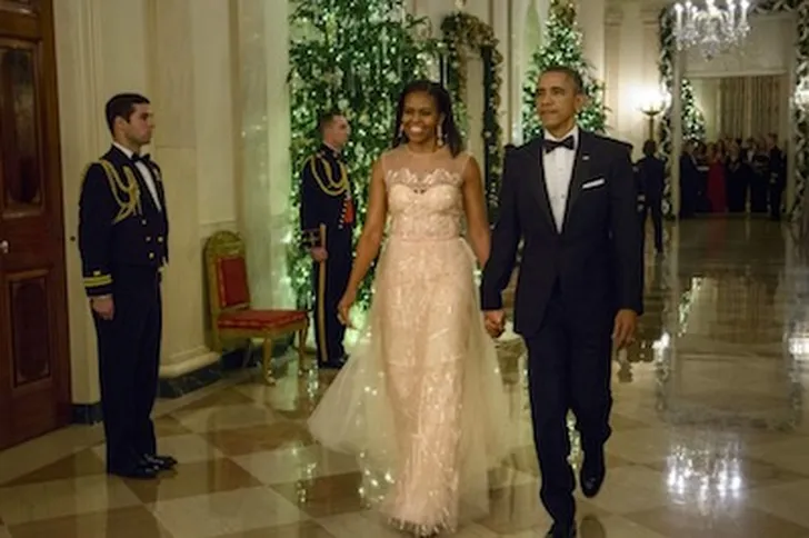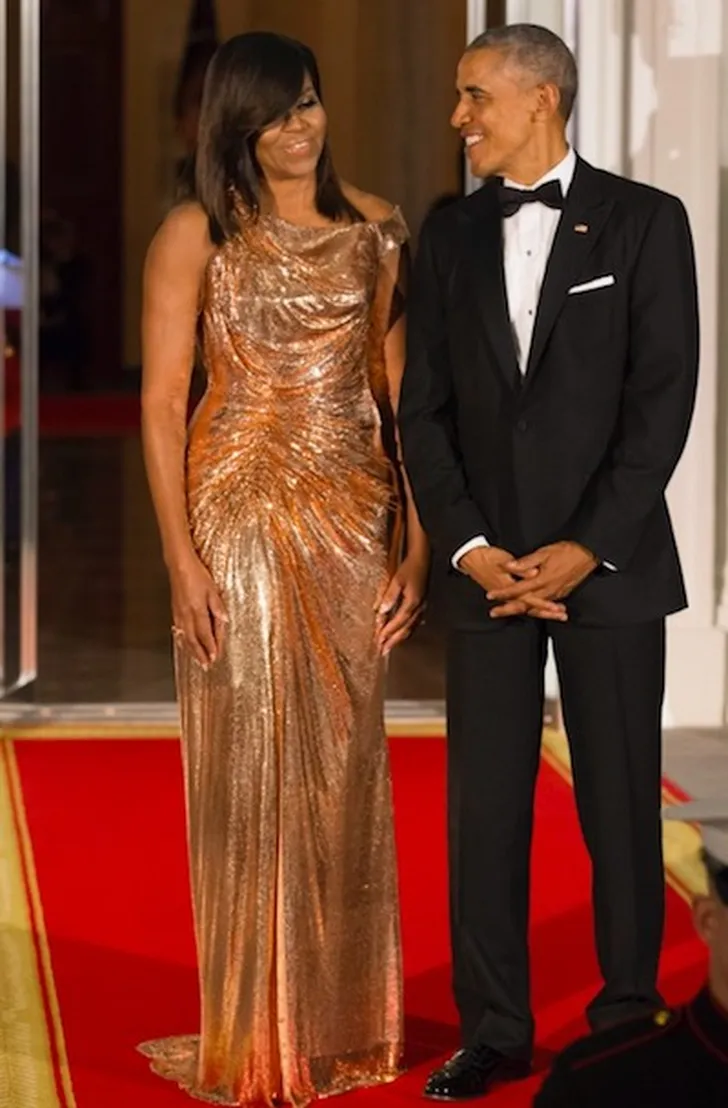 Michelle zorgde voor een wow-effect in 2014 tijdens een bijzonder diner in Washington. Alle ogen waren op haar gericht toen ze aan de arm van Barack verscheen in een blush-pink jurk van Monique Lhuillier. Haar look maakte ze af met een paar metallic pumps.