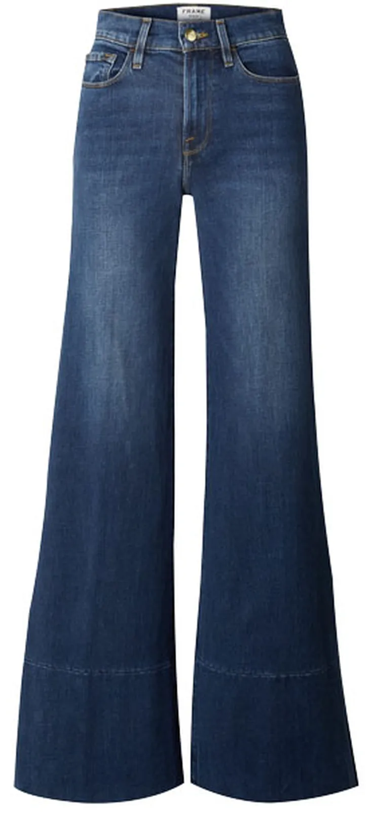Lange denim broeken met strakke pasvorm en wijd uitlopende pijpen zijn het dit najaar helemaal.
