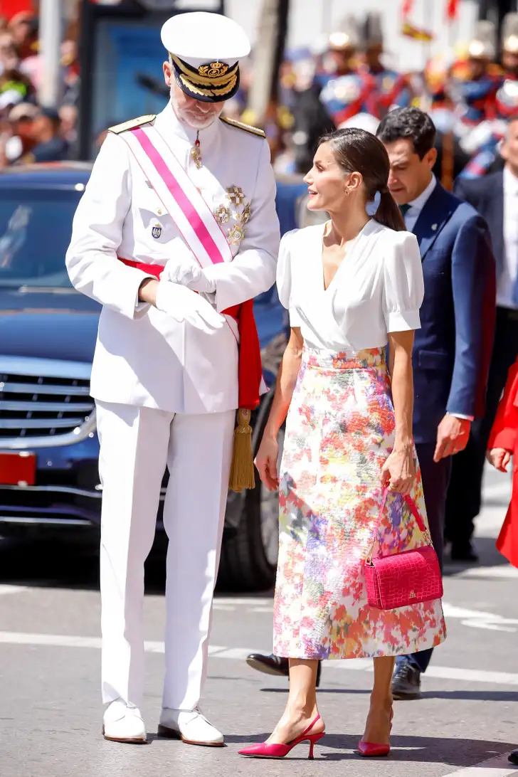 Bloemetjesrok. Het is geen woord waar de gemiddelde fashionista opgewonden van wordt. Maar als je ziet wat koningin Letizia van Spanje doet met een wit bloesje en een bloemetjesrok, dan verlang je toch onmiddellijk naar die combinatie, voor een prachtige zomerse look. Ze droeg haar bloemetjes naar de jaarlijkse nationale parade van de strijdkrachten.