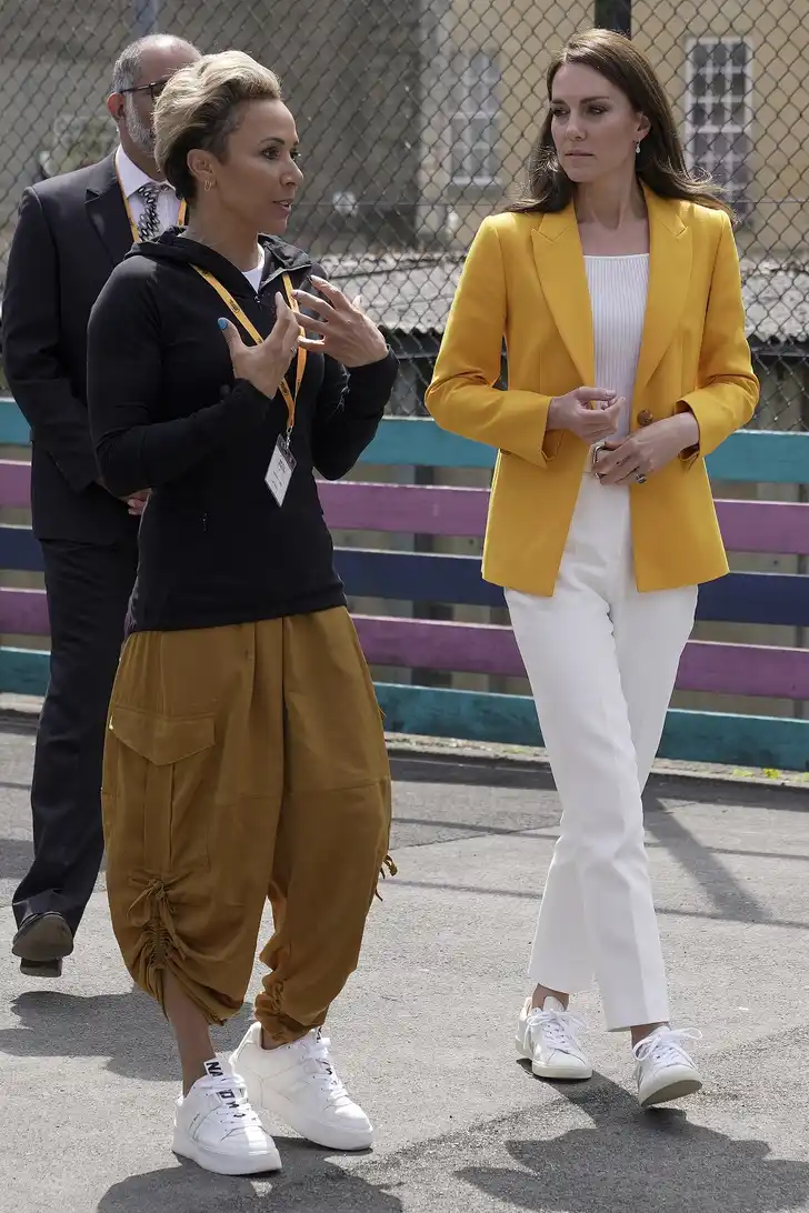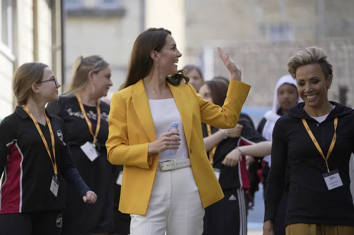 Catherine, de prinses van Wales, was gisteren op werkbezoek in het kader van Mental Health Awareness Week en zag er zonnig uit in een witte top en broek met daarop een vrolijke gele blazer #DopamineDressing (wat zoveel wil zeggen als: feelgood kleding).