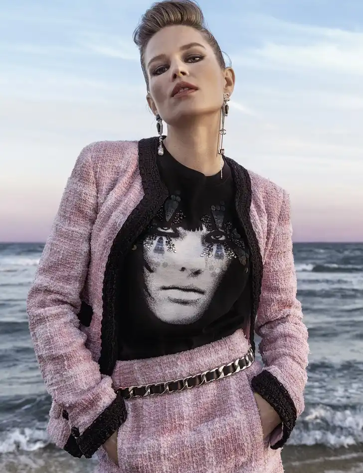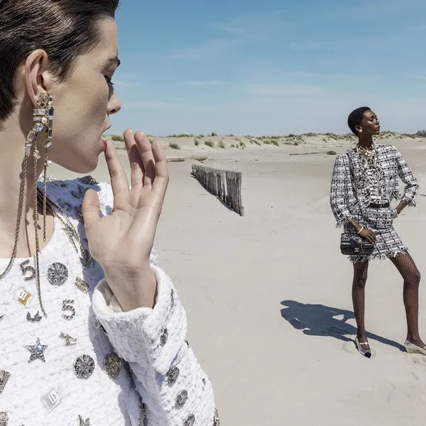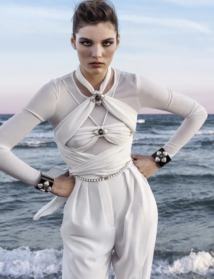 Die van Chanel voor 2022 werd dan ook gefotografeerd op een strand in Zuid-Frankrijk met modellen Louise de Chevigny, Mahany Pery, Lola Nicon (zij staat ook op een van de T-shirts) en Anna Ewers.