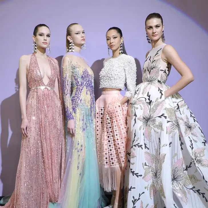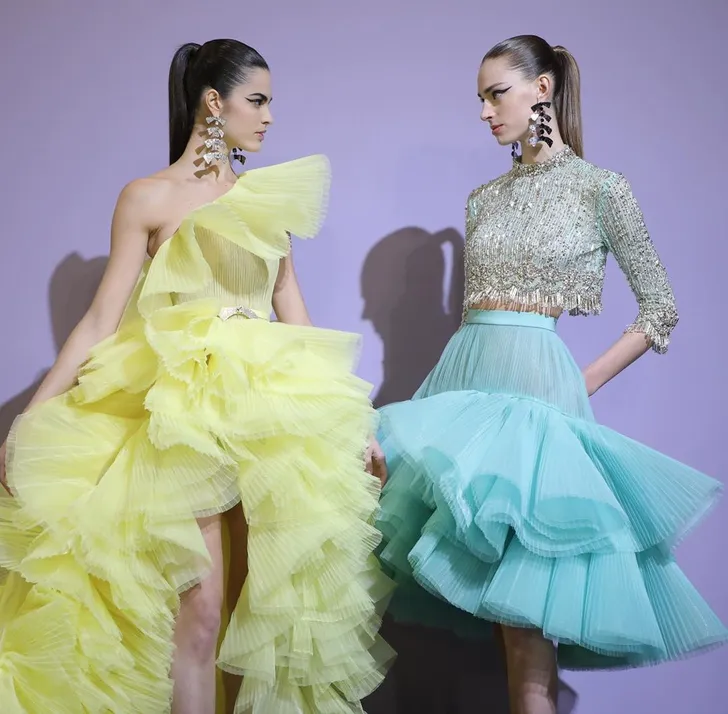 De S/S 2020 haute couture collectie van Libanese ontwerper Georges Hobeika doet denken aan een blauwe zomerhemel, roze schelpen en de glinsterende stranden van Sardinië.