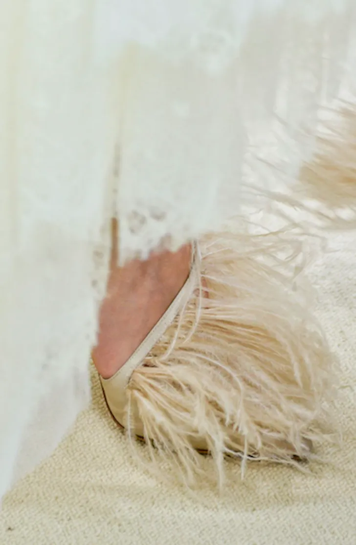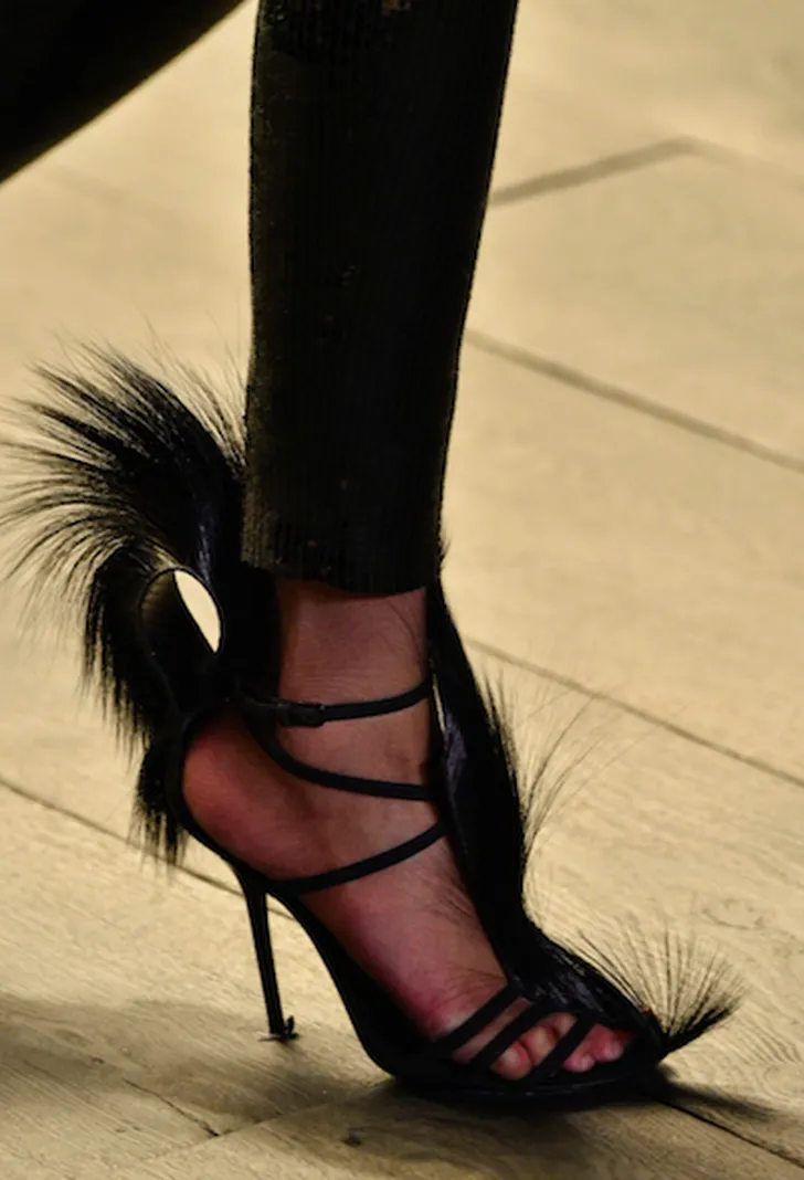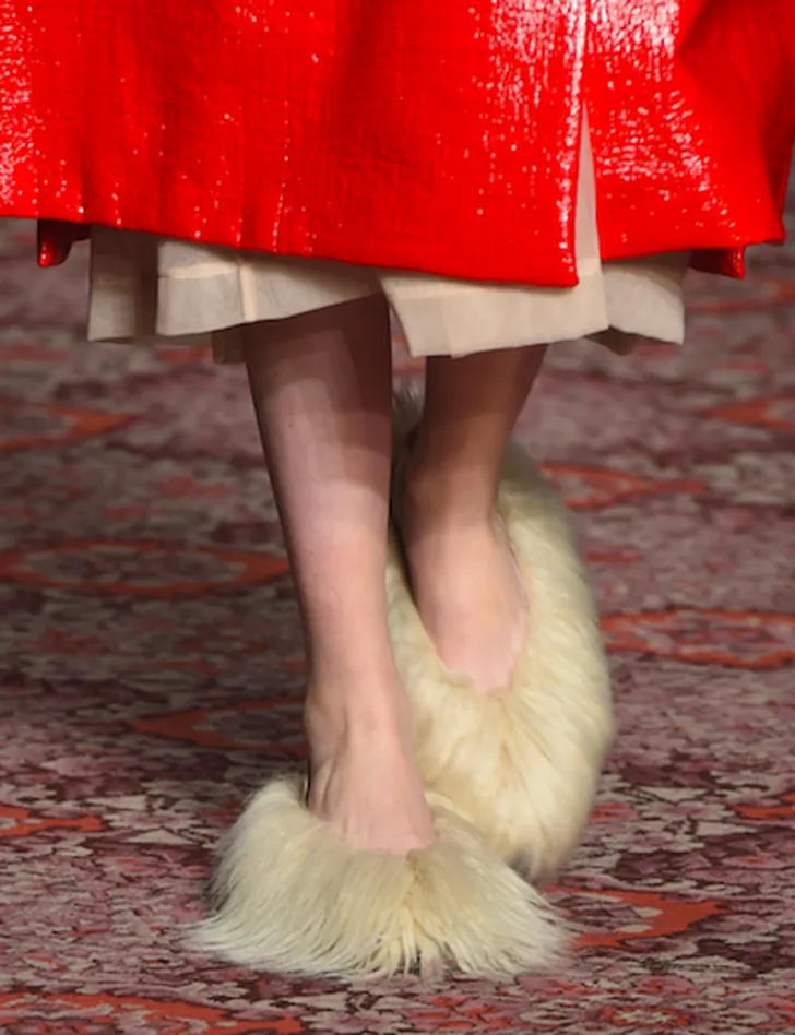 Maar ook kwamen we exemplaren tegen met een hoog aaibaarheidsgehalte. We kennen de beroemde loafers van Gucci met een bontje aan de binnenkant. Deze keer wordt er nog meer uitgepakt met haren. Op de schoen, aan de schoen of aan de binnenkant: alles is geoorloofd. Aai aai...