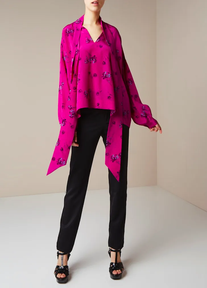 2. Balenciaga's vareuse blouse van zijde met bloemendessin van € 950,- voor € 665,-. Je koopt de blouse bij de Bijenkorf.