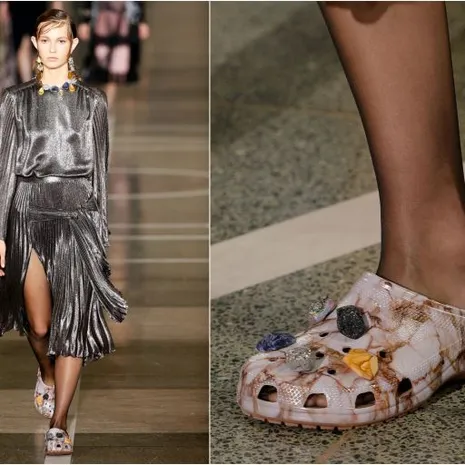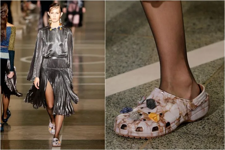 Voor de SS17 (spring summer 2017) collectie besloot Schotse ontwerper Christopher Kane om zijn avent-garde funky vrouwenkleding te combineren met Crocs. De charmes van deze plastic schoen worden opgekrikt door er kleurrijke buttons of kristallen aan te koppelen. Om deze bijzondere keuze nog even duidelijker te maken… Een typisch paar unisex Crocs klompen kosten slechts $35,-.Een paar zwarte Christopher Kane Crocs bewerkt met de kristallen beginnen vanaf $545,-