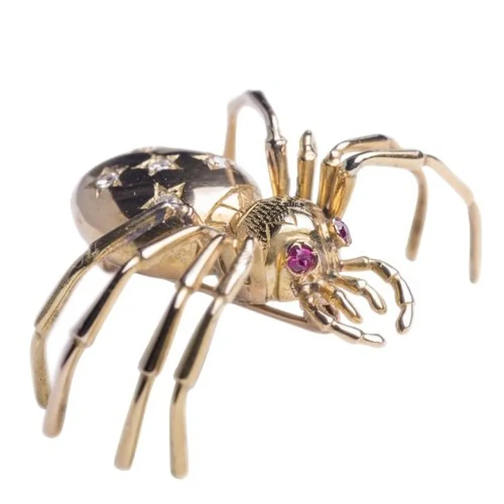 Gouden spinbroche met 5 briljanten en robijntjes als ogen (Jack de Rooy € 1450)