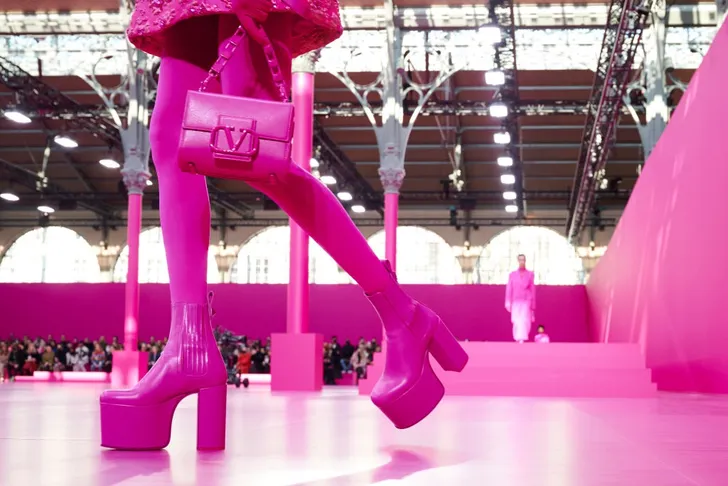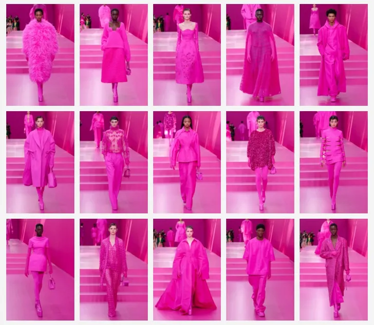 Het effect was een soort colourblocking 2.0 die verrassend veelzijdig oogde, ondanks het beperkte kleurgebruik. Piccioli noemt het roze 'een tegengeluid op de zwarte en witte looks die je zo vaak ziet.'