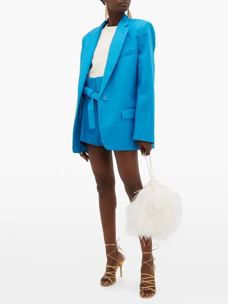 Blauw shortspak van The Attico (Matches Fashion € 570 voor de short, het jasje kost € 990)