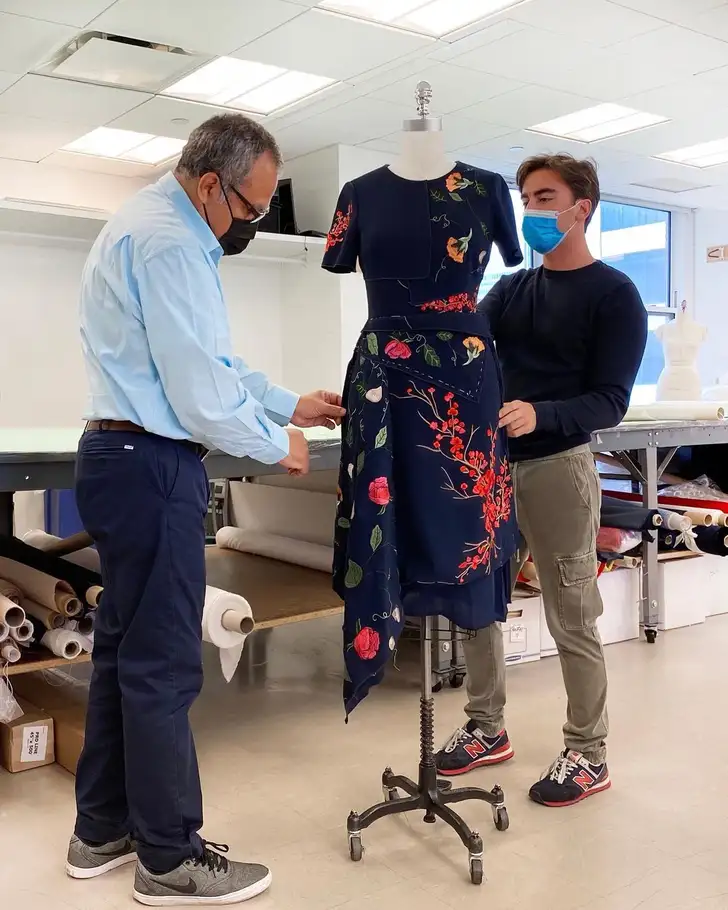 De jurk heeft een asymmetrische draperie waar Oscar de la Renta om bekend staat en vrolijke geborduurde bloemen. Co-creative director Fernando Garcian en kleermaker Luis leggen er hier de laatste hand aan, voor Jill hem zou dragen op de avond dat haar man Joe tot winnaar van de verkiezingen werd uitgeroepen. Eronder droeg ze een paar Katience pumps van Jimmy Choo.