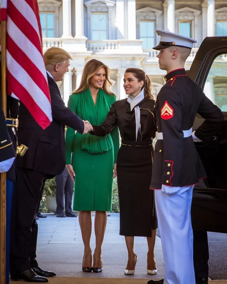 Ivanka Trump droeg de afgelopen vier jaar heel vaak Oscar de La Renta, Melania Trumps smaak ging meer uit naar andere Amerikaanse designers zoals Ralph Lauren en Calvin Klein. Toch hebben we er eentje gevonden: deze groene Oscar droeg de First Lady in 2017 bij de ontvangst van koning Abdullah en koningin Rania van Jordanië.