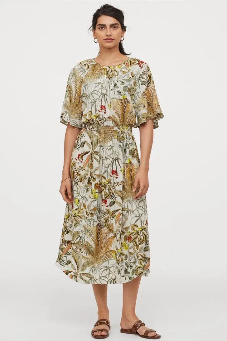 Midi-jurk van luchtige, geweven viscose met een ronde hals met een rimpeleffect en wijde raglanmouwen tot op de elleboog (H&M € 20)