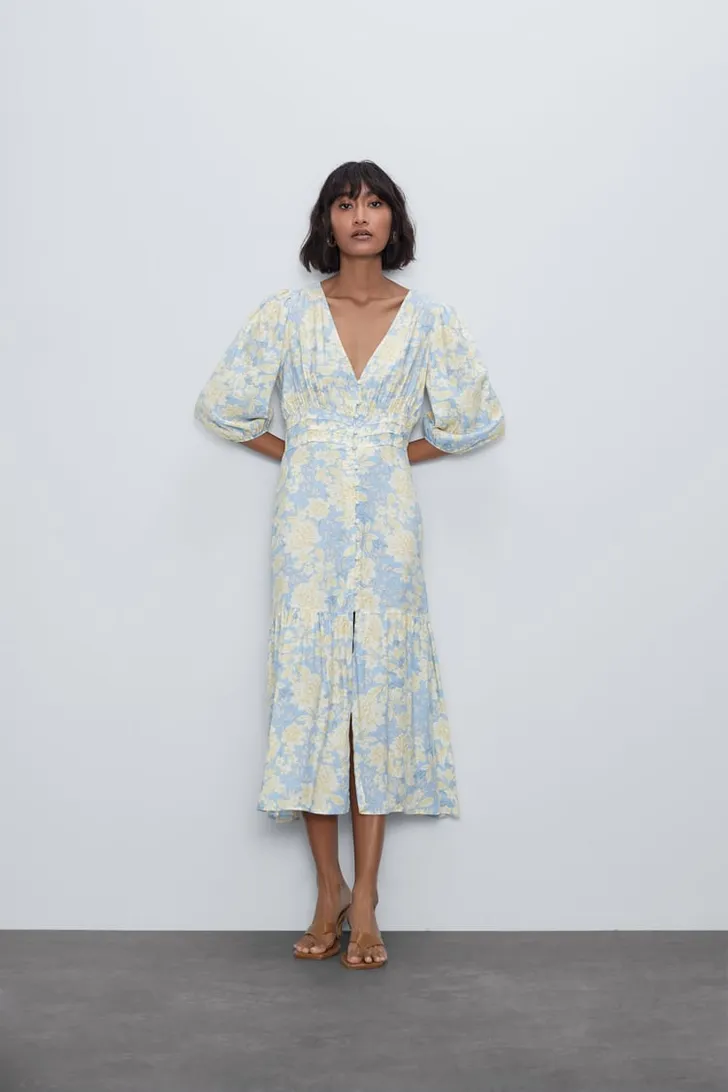 Midi-jurk met V-hals en mouwen tot over de elleboog met ballonaccent bij de schouders (Zara € 50)