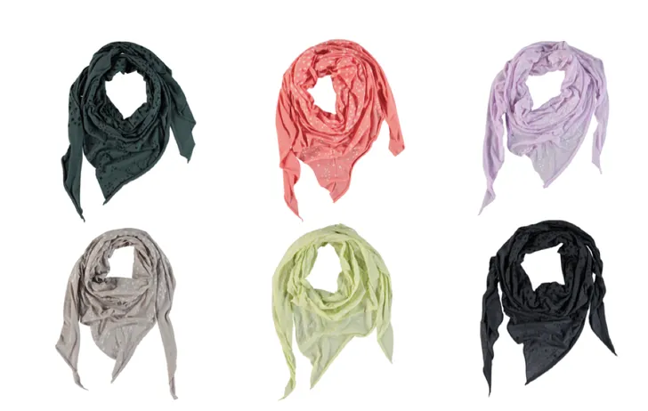 Een unieke wrap die zowel als shawl, maar ook als haarband gedragen kan worden. Een zachte katoenen wrap met de iconische HUMANOID kruis print, verkrijgbaar in de kleuren flamin, flour, green, lilac, orchid en slate.