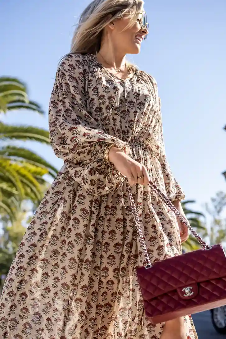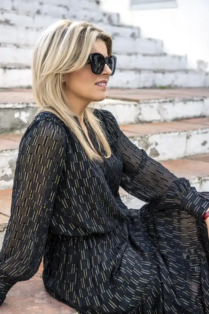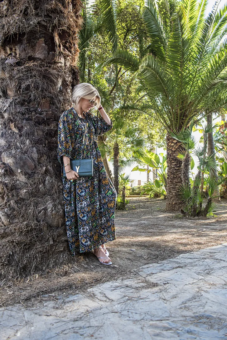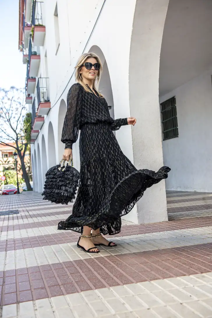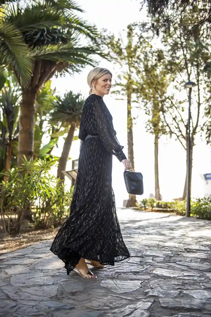 De Jaipur dress is absoluut één van de favoriete items van Lonneke. De lange zwarte maxi jurk met grote pofmouwen en gouden details is perfect voor een chique tuinfeest of ’s avonds op het strand bij een romantisch diner. Style deze jurk met subtiele accessoires zoals een mooie tailleriem, een eenvoudige clutch en slippers of een hakje, waar je maar zin in hebt.