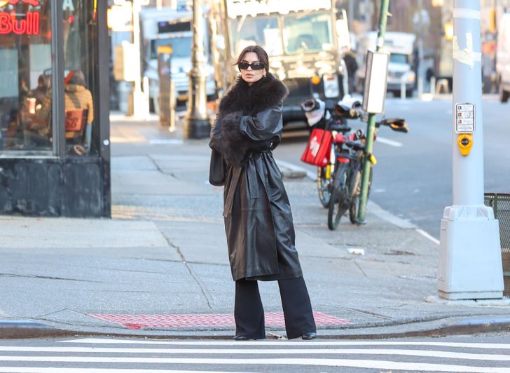 Voor de frisse lentedagen is een leren trenchcoat met faux fur-details een heerlijke optie. Emily Ratajkowski combineert haar lange jas met een fijne jeans en hoge hakken, waardoor haar outfit comfortabel maar elegant oogt.