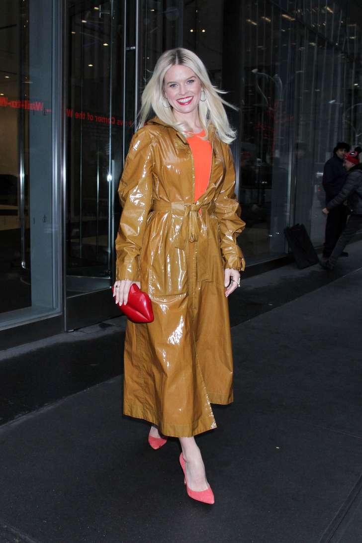 In plaats van een zwart exemplaar kiest Alice Eve voor een vrolijke kleur, waardoor de uitstraling van haar outfit minder hard en stoer is. De combinatie van haar hakken, tas en top zorgt voor balans in het geheel.