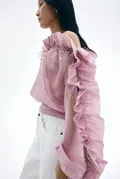 Deze oversized blouse is gemaakt van een geweven stof en heeft een asymmetrische halslijn met drawstrings aan de zijkanten, waardoor je de pasvorm naar wens kunt aanpassen. De volant langs de hals die doorloopt over één van de mouwen voegt een speelse, doch chique touch toe. De lange ballonmouwen met elastiek onderaan en de brede pas met smokwerk op de rug zorgen voor een verfijnde afwerking.