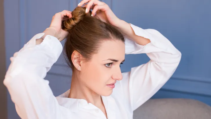 - Inhaken: Pak de pin. Nu komt de truc: steek de pin eerst horizontaal (of zelfs een beetje van onder naar boven) in de rand van je knot. Je pakt hierbij alleen het haar van de knot, nog niet het haar op je hoofd.