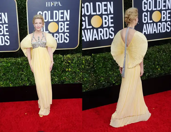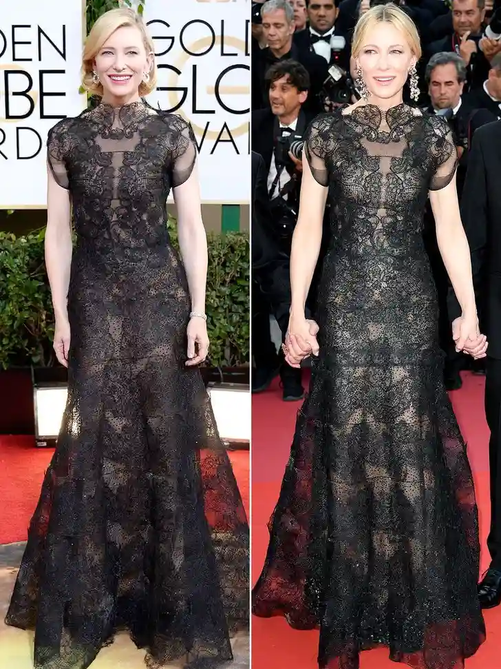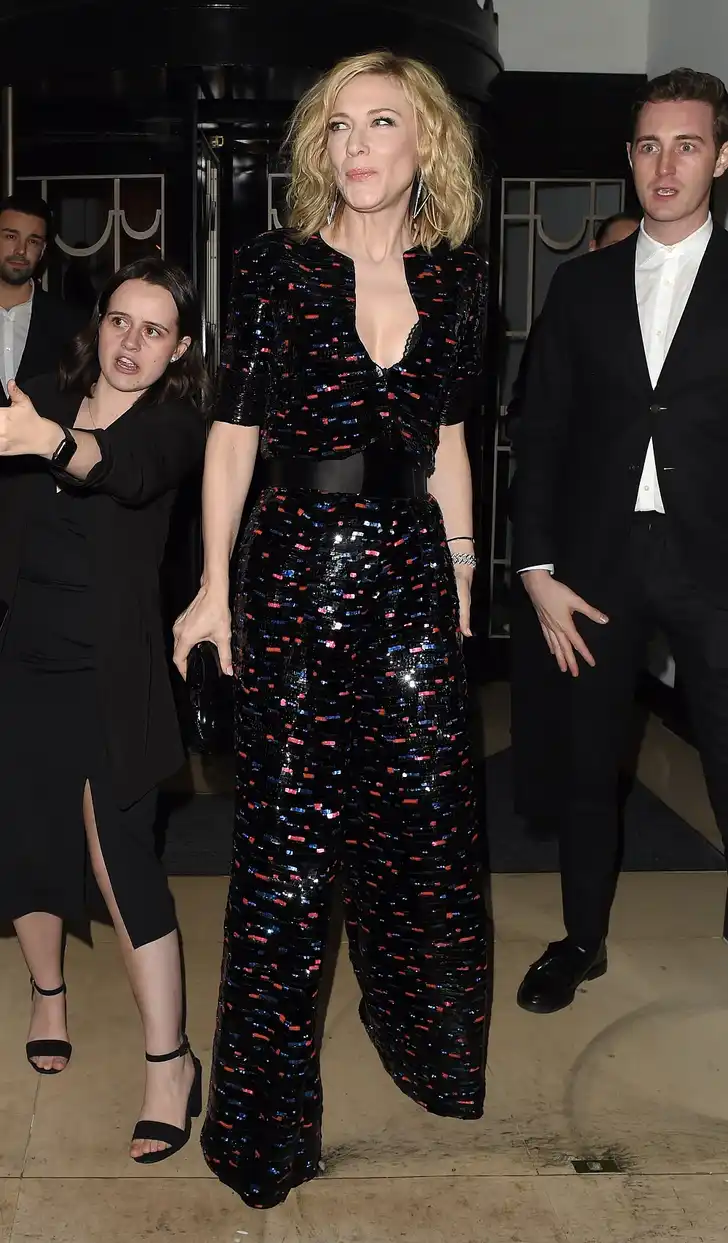 Blanchett is trendsetter in een galajurk vaker dan één keer dragen, momenteel erg in zwang om te laten zien hoe duurzaam je bent. Cate doet dat al jaren. "Ik weet inmiddels hoeveel liefde en werk er in een jurk of pak van Armani is gaan zitten, het zijn kledingstukken die het verdienen om veel vaker gezien te worden. Geen van mijn vriendinnen draagt haar kleding slechts één keer, ik doe dat ook niet." Deze jurk is van Armani Privé.