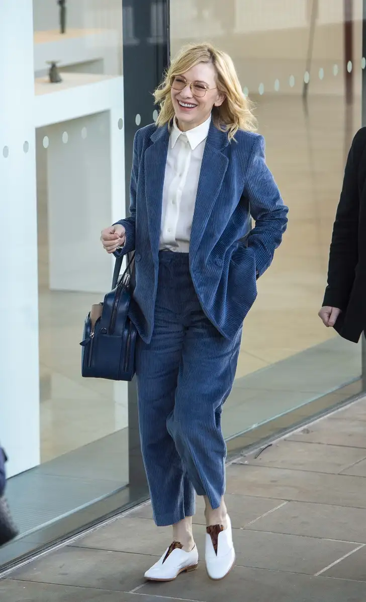 Cate bezit talloze pakken, van smoking tot dit ribfluwelen pak. Ze draagt broek en jasje vaak samen, maar handig aan een pak is dat je de twee delen ook afzonderlijk met andere kledingstukken kunt combineren.