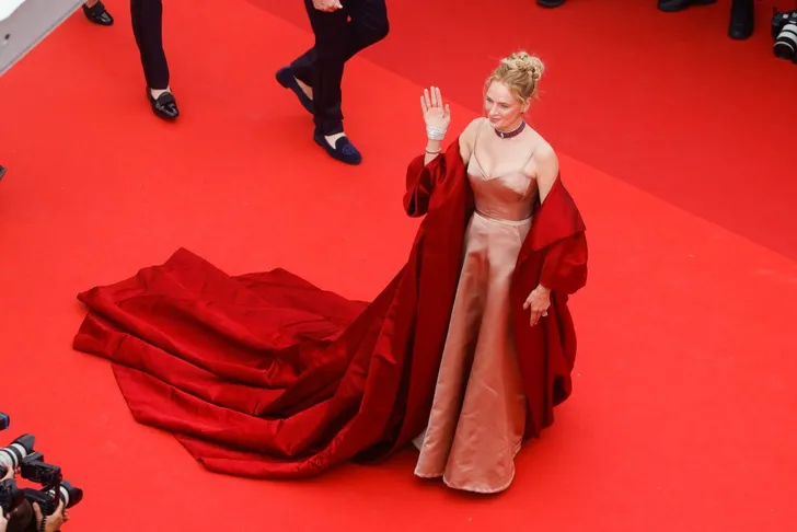 Uma Thurman kon qua koninklijke sleep concurreren met zowel Farhana als Elle. De creatie is van Dior Haute Couture.