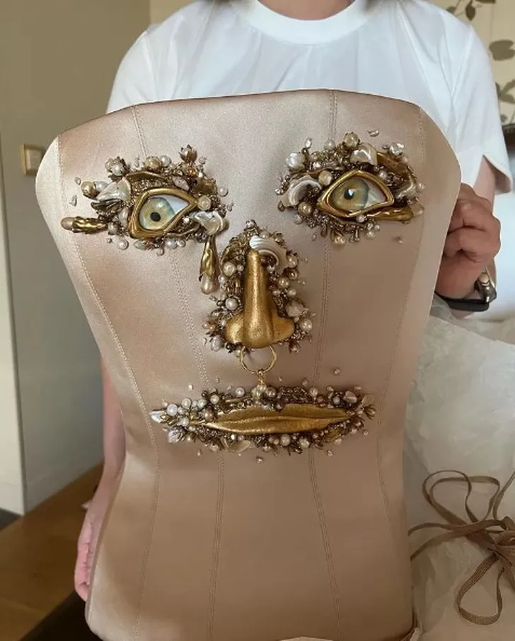 Michelle koos een mooie Face of Happiness jurk met een los korset dat was versierd met de decoraties waar Daniel Roseberry, de creative director van het label, om bekend staat: een gezicht met goud en parels, compleet met neuspiercing.