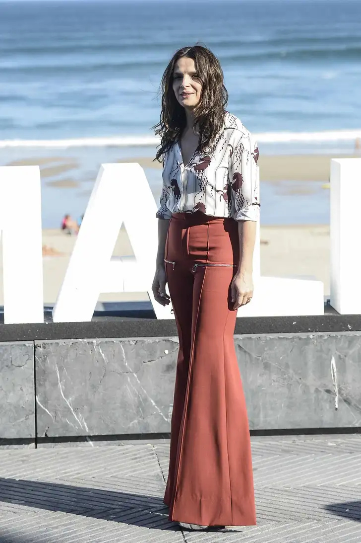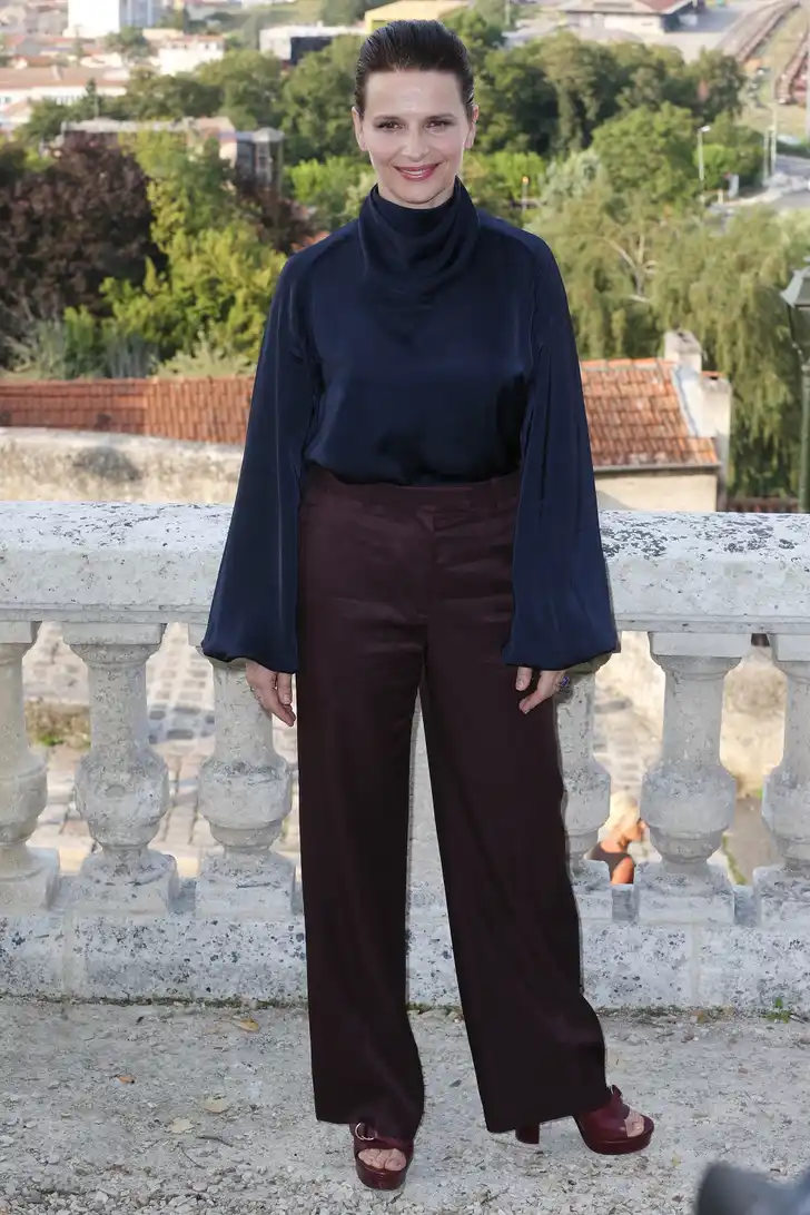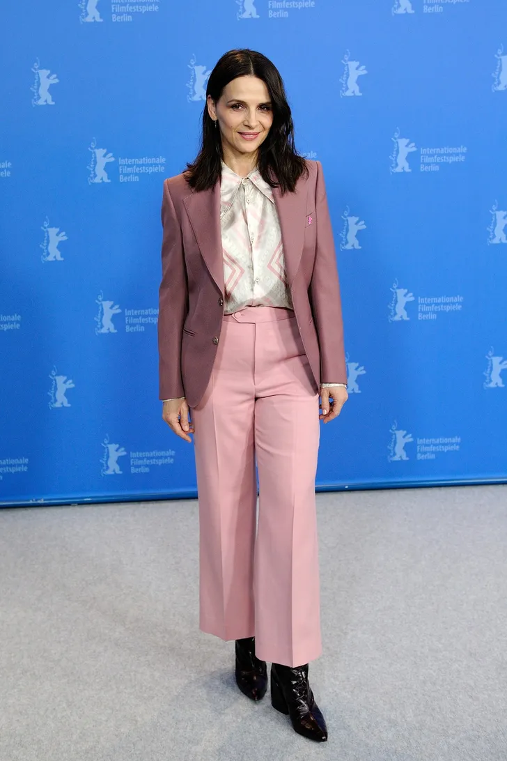 Binoche is een fan van de broek-met-blazer-combinatie: "Zakken en comfort, je bent gek als je voor een rok gaat."