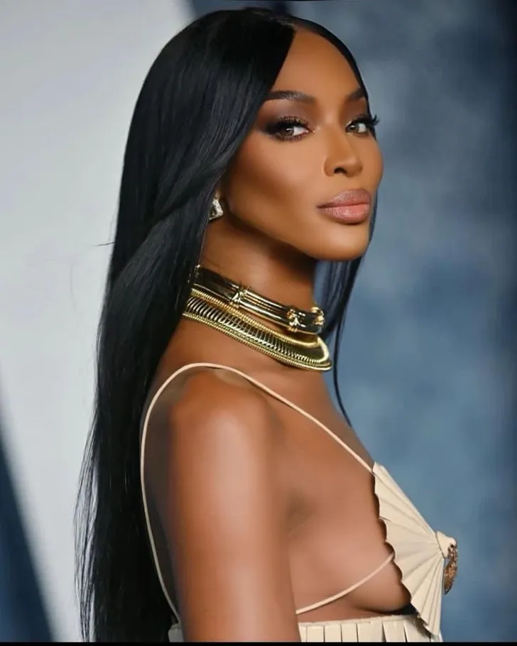 Naomi poetste echter alle plooitjes in haar arm en bij haar oksel wel, zodat ze daar nu buitenaards strak oogt. Ze egaliseerde verder haar teint iets lichter en matter en prutste aan haar kaaklijn en neus. Wat dus echt niet nodig was, want de originele look is al absolutely wow.