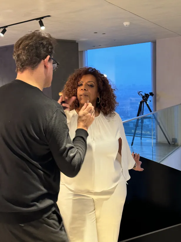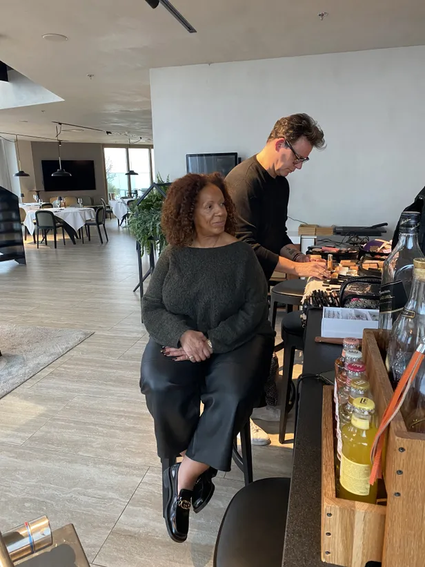 "Visagisten hebben de neiging hun eigen look neutraal te houden. Maar nu Angelique Woudenberg door haar boek zelf in de spotlights staat, mag ik haar af en toe glammen. Natuurlijk geef ik ook meteen tips voor de donkere huid."