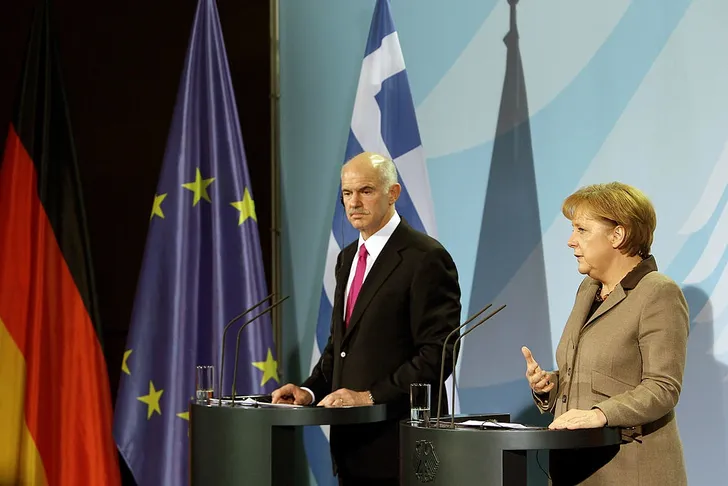 Links Griekse minister-president George Papandreou, rechts Merkel, in 2010.