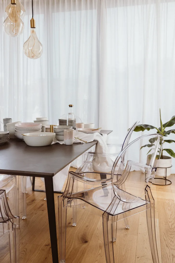 ... met eettafelstoelen van acrylglas en lampen in peertjesvorm. Ze is er heel gelukkig mee: "Mijn leven is niet volmaakt, maar het heeft wel volmaakte momenten."