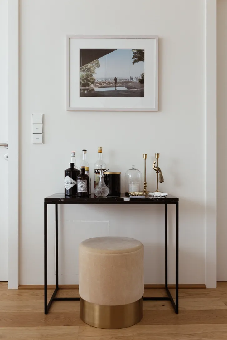 Er zijn echter grenzen aan hoeverre Vicky wil meegaan in de sobere smaak van haar vriend: her en der zijn gouden accenten te vinden...