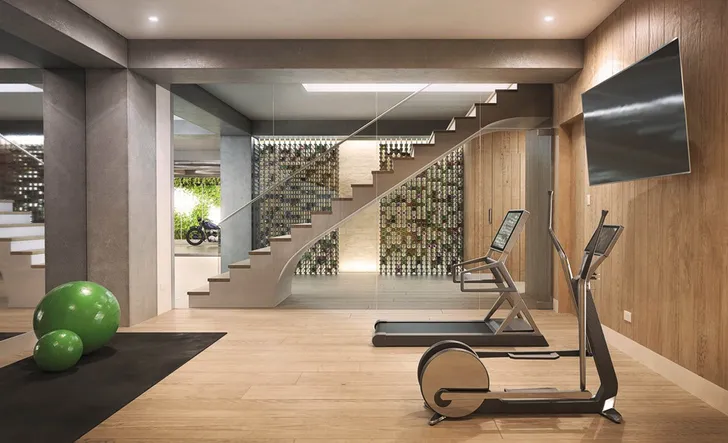 .... een gym met een glazen wand én een wijnkelder (niet afgebeeld) met een glazen wand...
