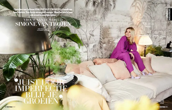 Vrouw van de wereld Simone van Trojen ken je van LaDress. In de nieuwe Nouveau praat ze onder andere over de schoonheid van imperfectie: "Het zorgt er ook voor dat je wilt blijven groeien en je ontwikkelen. Laten we elkaar daarin een beetje optillen, zeker vrouwen onderling, in het kader van sisterhood."
