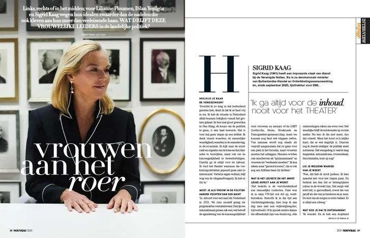 Krachtige interviews met vrouwelijke leiders Lilianne Ploumen, Dilan Yeşilgöz en Sigrid Kaag. Die laatste zegt: "Van mannen wordt nog steeds als vanzelf aangenomen dat ze gaan voor een plek in het torentje, maar vrouwen moeten het uitleggen. Mannen worden ook omschreven als 'gezinsmannen' en vrouwen als 'werkende moeders'. Ik ken alleen maar 'gezinsvrouwen', die er ook nog een fulltime baan bij hebben."
